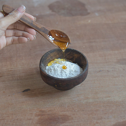 In a bowl, add oats flour and enough honey too make a paste.