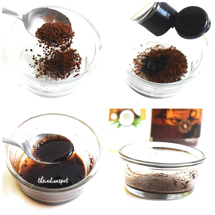 To make and use the eye mask, put tablespoons of coffee powder into a bowl. Then add in 2 tablespoons (equal ratio or equal proportions) of coconut oil. Give the mixture a good mix making sure the coffee powder and coconut oil are well incorporated.